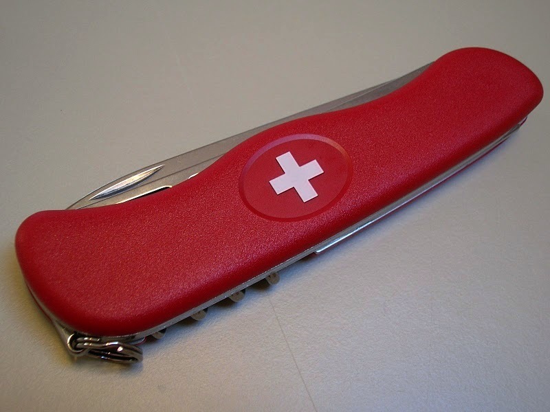 - 2013: The regular version of the Käsemesser, the Victorinox Cheese Knife became generally available, but with standard red Nylon scales; with the grey lock-release button; the regular silver outlined Victorinox shield; and the tweezers. It did not include the special scales or packaging of the original SCM version. (It is possible this version was initially released as a Special Edition in the US (Model: 80833) , Australia, and a few other markets) (...retired)