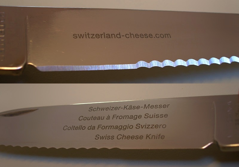 The English language website etched on the blade of the original version (www.switzerland-cheese.com) does not exist anymore, however switzerland-cheese.ch in French, German and Italian re-directs the user to the current websites and www.cheesesfromswitzerland.com appears to be the current SCM website, and the corresponding French, German and Italian also exist.