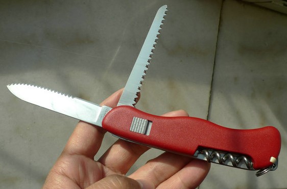 - Large blade - Slide-locking, partially serrated with serrations at the tip end