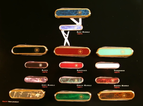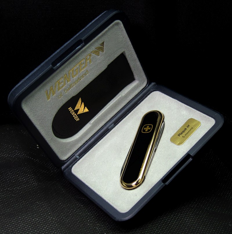 The Macao Series models often came packaged in blue jewelry boxes with grey-velvet lining, and included a black leather slip-case with a folding closure and the Wenger logo in gold. They were also sold in ordinary cardboard knife boxes with a more common Elite series velvet slip-case.