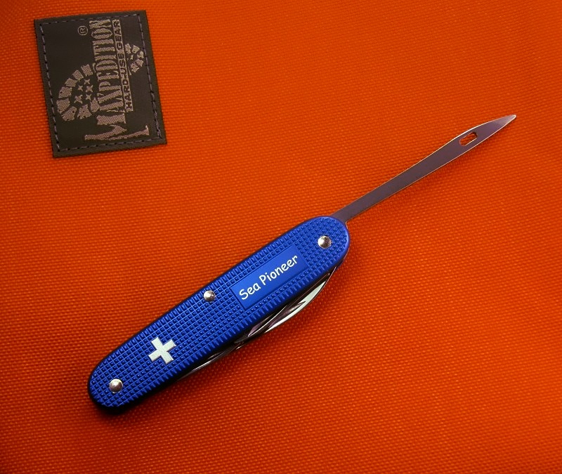- In December 2010 Victorinox manufactured a special-run of fifty models with the the name Sea Pioneer. These models featured blue Alox scales with the old style silver cross, and a top advertising panel with Sea Pioneer imprinted in white. Each of these knives feature a series number (n/50) stamped on the main blade. This was the first knife issued in what would be come known as the Blue Marlinspike Series.