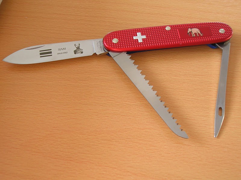 - SIAM commemorative knife was produced in March 2011 for collectors in Thailand. This model is bi-color featuring a dark-red top-scale, and a blue bottom scale. The top scale is the old advertising style with a large silver Swiss cross, and an light copper toned elephant illustration outlined in black in the printing panel. The blades are stamped with a serial number from the run (50/n) on the reverse side (centered); only 50 knives were made.