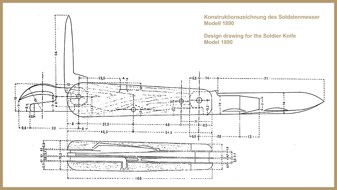 - The 1890 Model was redesigned in 1951, creating a scaled down version of this knife, resulting in the lighter weight, smaller 93mm Soldier's Knife still with fibre scales (handles).