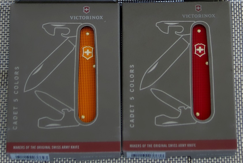 The silver anodised model features the newer silver shield with grey outline. The blue anodised model is an uncommon shade for the Cadet that had not been manufactured before, except in small quantities. It is similar to that used on some 93mm models.The orange anodising is also uncommon outside of the US, where it was used in 2011 for a dealer special run of regular Cadets (estimated production less than 500).