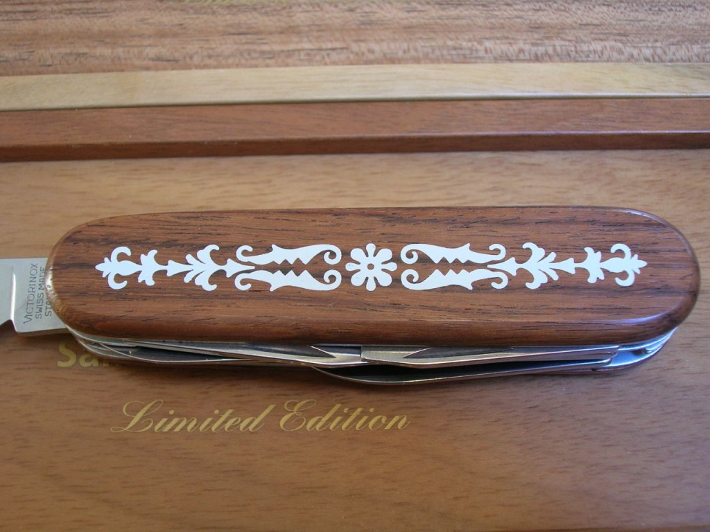 The rosewood front scale bears a stunning, delicate, coloured wood marquetry inlaid pattern. On some of the editions the reverse scales also carry the same marquetry. The Victorinox logo is printed on editions that do not have the reverse marquetry.