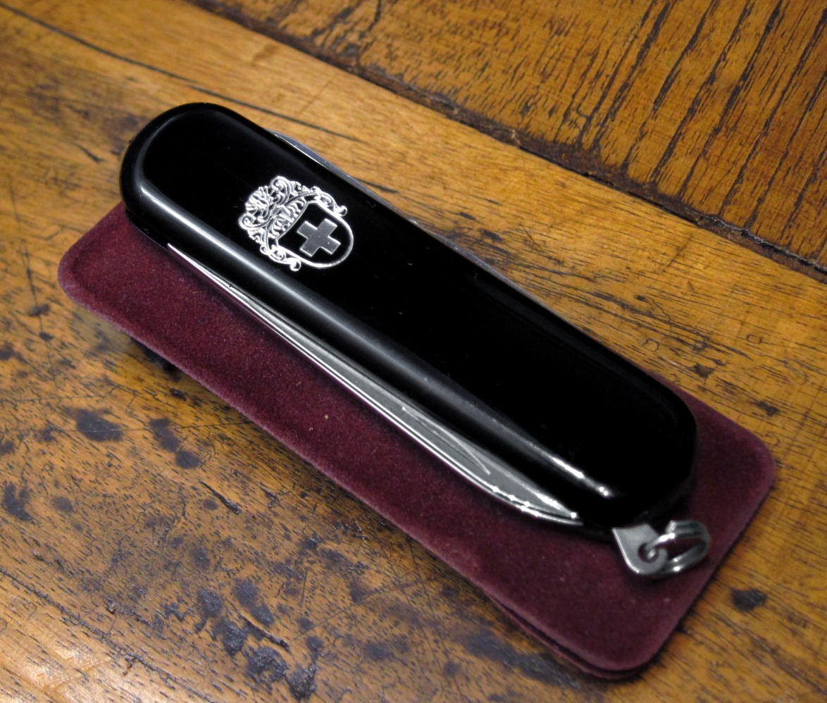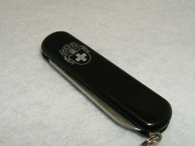 Black, a special crest unique to this model replaces the standard Wenger emblem.